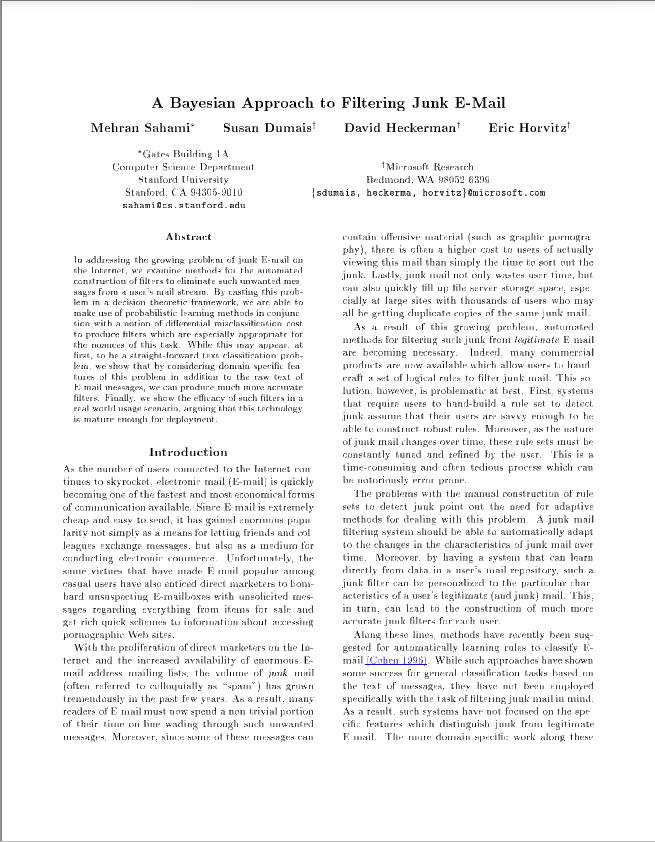Bayesian spam filters are generally known at a popular level in knowledgeable tech circles. I believe Paul Graham made it better known in these groups long back. I have vague recollections on the topic from a decade or so ago. The paper in question “A Bayesian Approach to Filtering Junk E-mail” was done in 1998 by a collaboration between researchers in Stanford and Microsoft Research.
