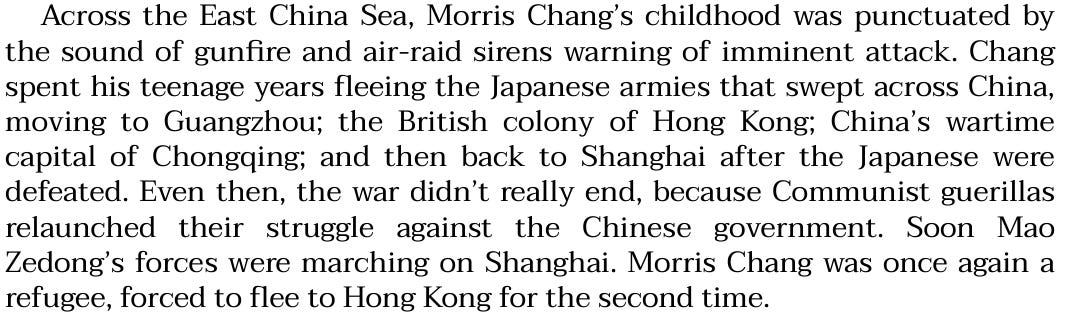 On the Chinese side — Morris Chang, the TSMC founder was fleeing Japanese in WW II: