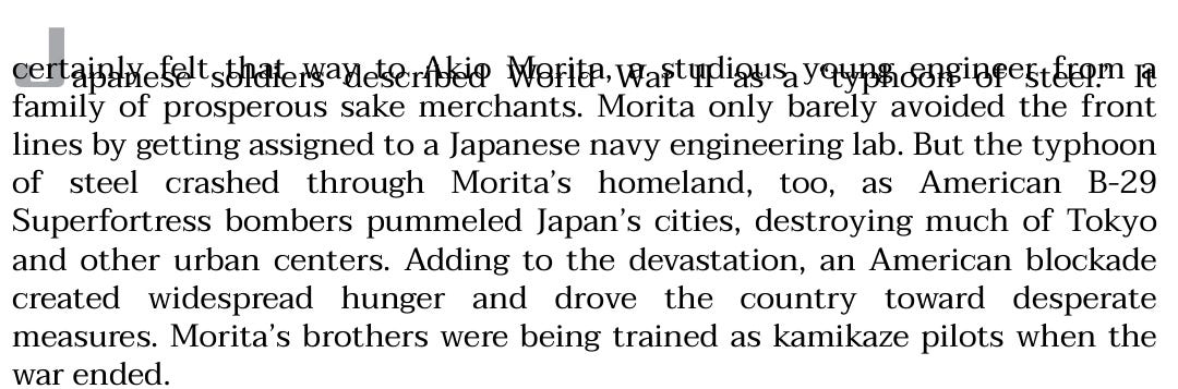 From Japanese perspective - Akio Morita (Sony Founder) perspective — World War II was a “typhoon of steel” — because the war was operated from an industrial power base, particularly through continuous bombing, shelling and firing bullets: