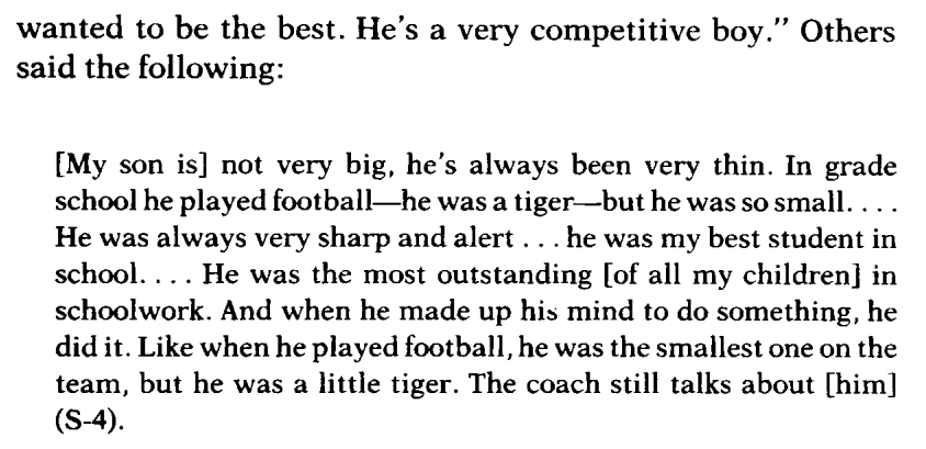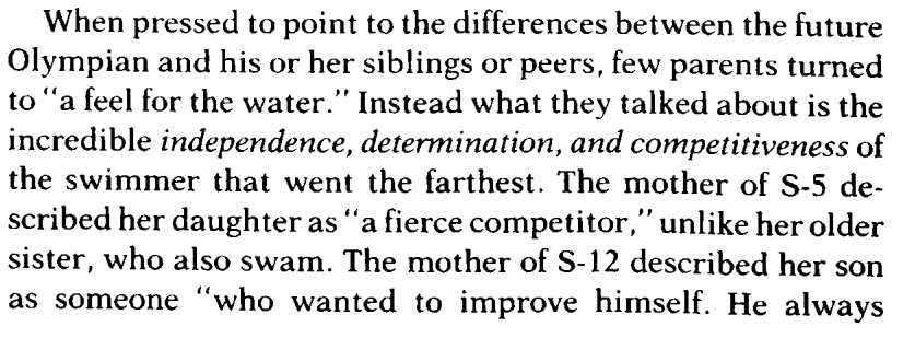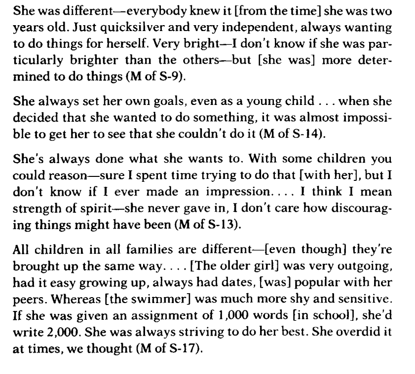 The parents remembered the child swimmer’s mental characteristics and attitudes more than their affinity for water: