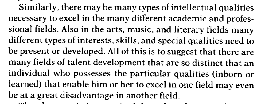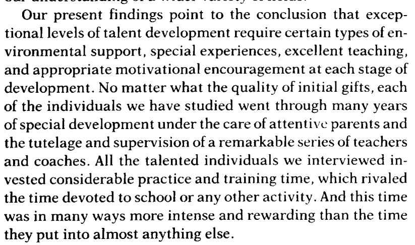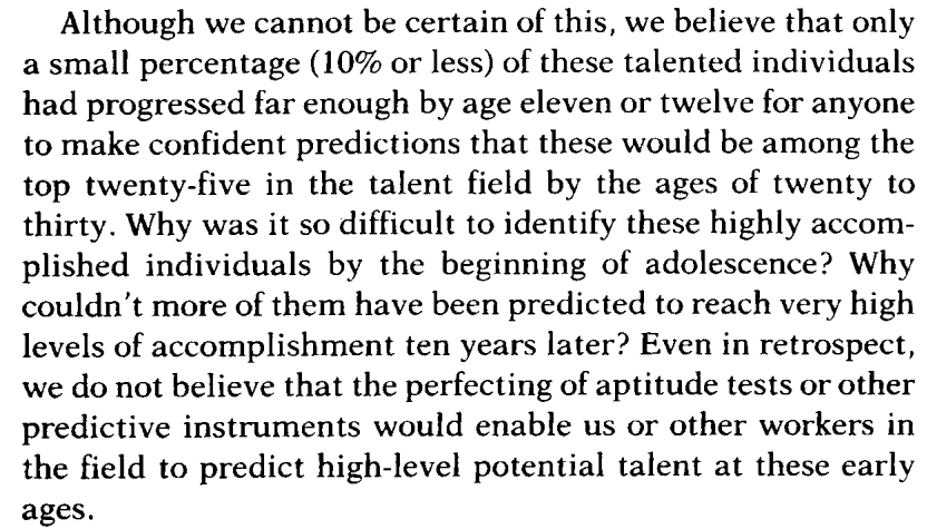 One of the most important points coming out of the book - at age or twelve, one couldn’t make a prediction of what will happen of a child. Inborn talent is not sufficient to predict what one may do. Talent development is the determining factor deciding whether great outcome is achieved or not in a person’s journey: