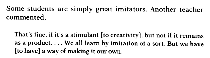 The third stage is “individualized creativity”. At this stage the focus is on making the art and craft one’s own and developing one’s own style: