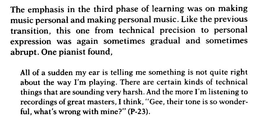 At the third level - there is encouragement to find one’s own style. No two musicians should play the same piece the same way. There must be something of the person infused in the performance: