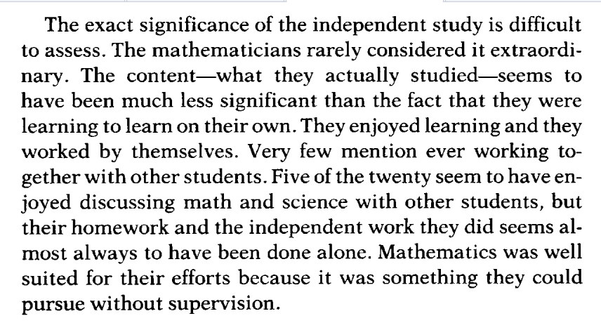 Mathematicians are almost always lone-wolf - they just teach themselves things: