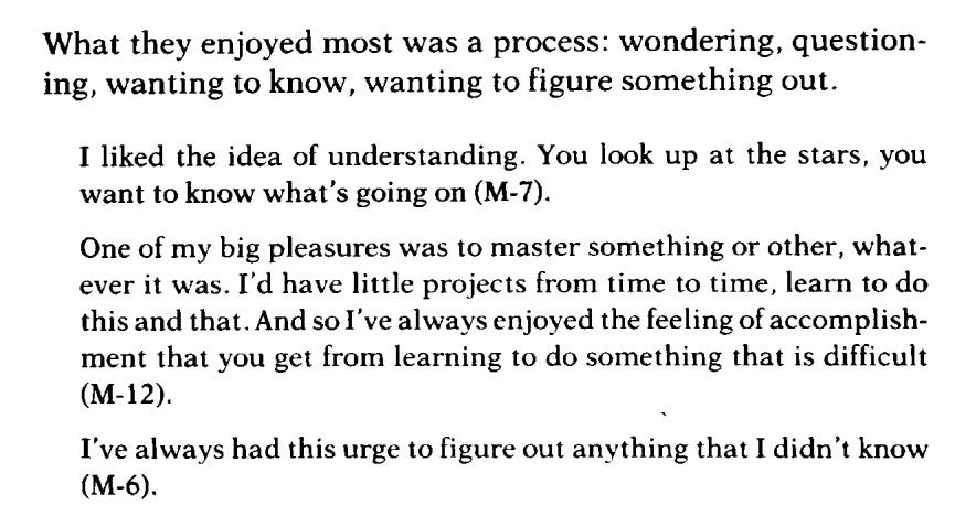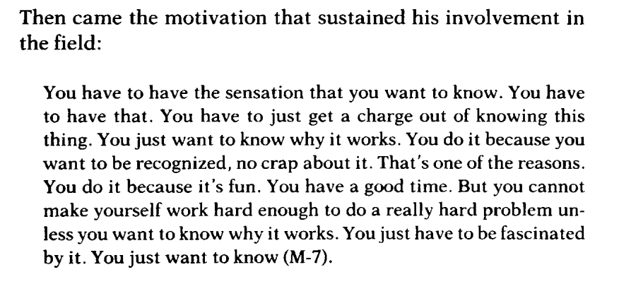 A pure need for knowledge is necessary. The drive for recognition, fun and so on is not enough: