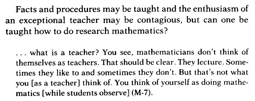 Real mathematical teachers are doers; and from observing their actions the learner leads how to proceed: