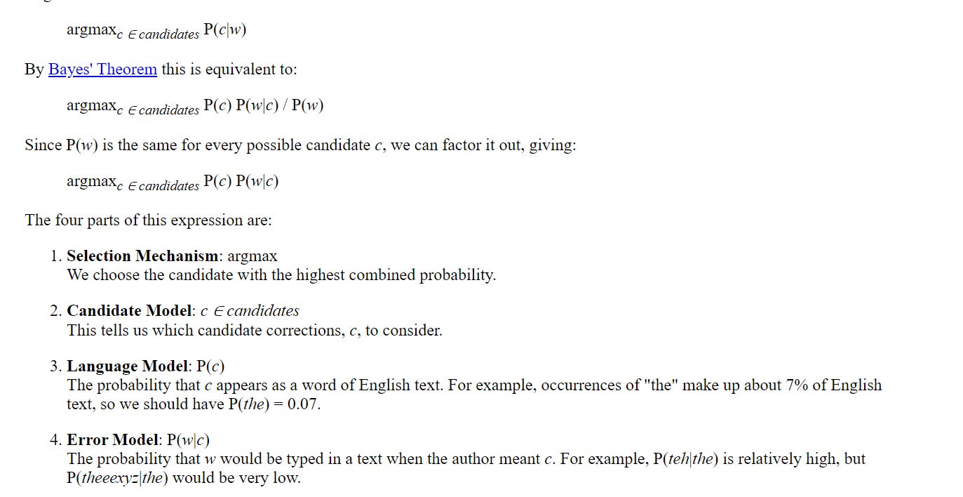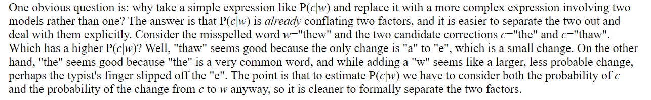 Norvig gives a quick refresher of Bayes theorem. But I like the terminology here such as “language model” and “error model” and so on.