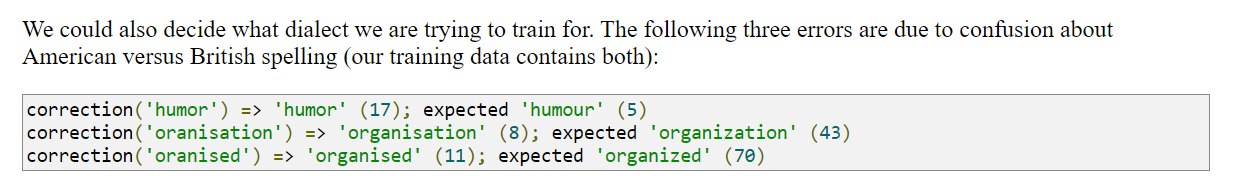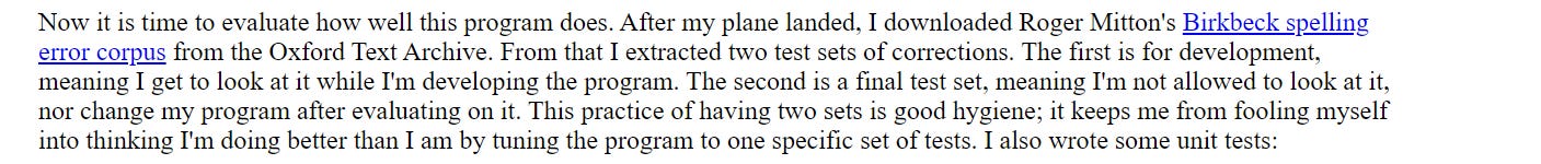 I’m going to skip Norvig’s explanation of the Python code itself, because I think my previous post covers is clearly enough. We will jump to his comments on Evaluation - where we hope to find information how to build the test set, etc.