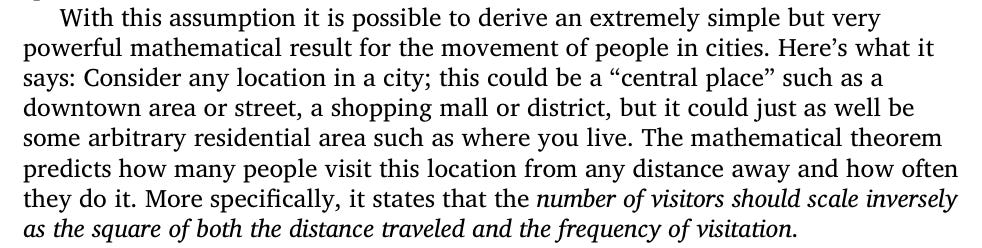 People’s movements in cities are highly regulated; they have set places they usually goto, and try to take the shortest and fastest paths. And - number of visitors per place is inversely proportional to distance traveled and frequency of visitation: