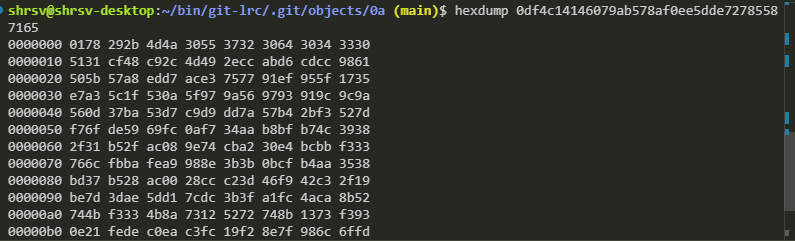 Was trying to figure out what type of object the file showed above is. It starts with 0178, that’s for zlib. Git compresses data. So we cannot hexdump the file directly.